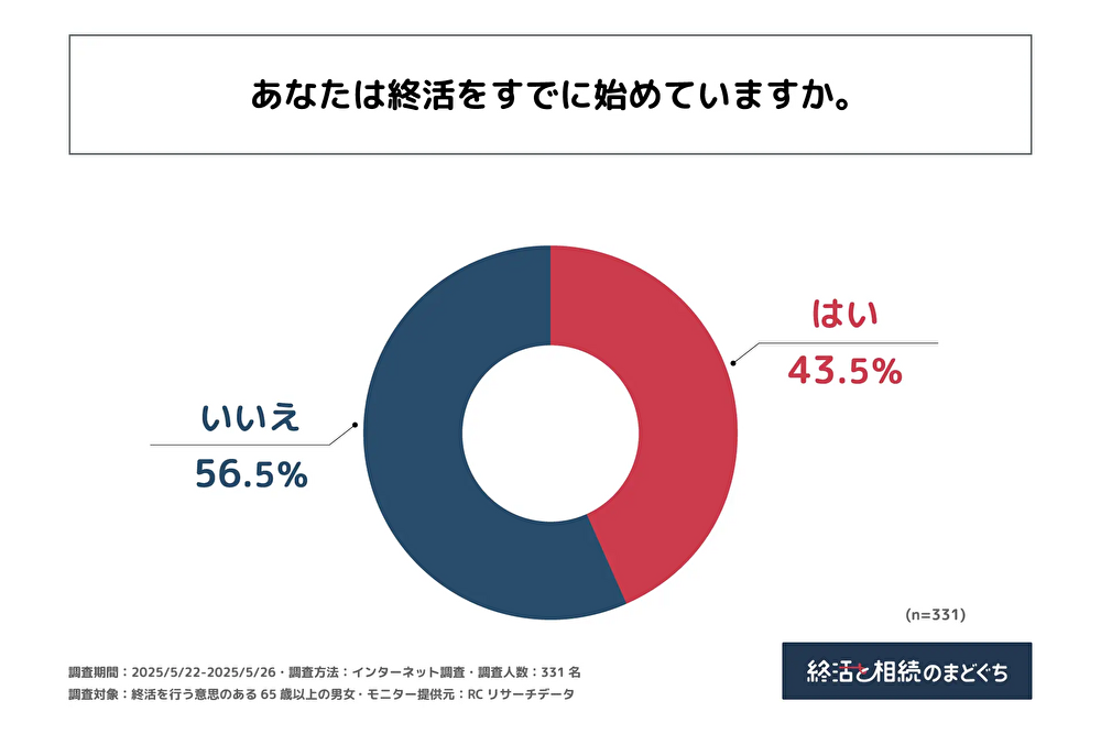 「終活をすでに始めているか」を尋ねたところ、「はい」が43.5%、「いいえ」が56.5%。終活への意思を持つ層の中で、4割超が実際に着手済みであることが分かりました。
