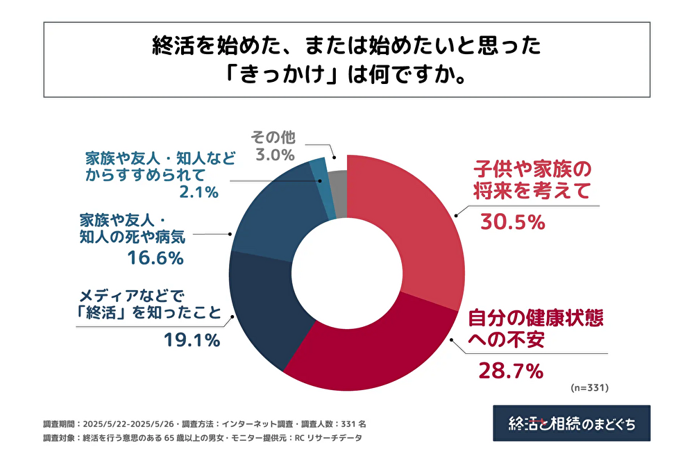 「終活を始めた/始めたいと思ったきっかけ」は、1位:子どもや家族の将来を考えて(30.5%)、2位:自分の健康状態への不安(28.7%)、3位:メディアで『終活』を知った(19.1%)。家族配慮と健康面の不安が主な推進要因でした。