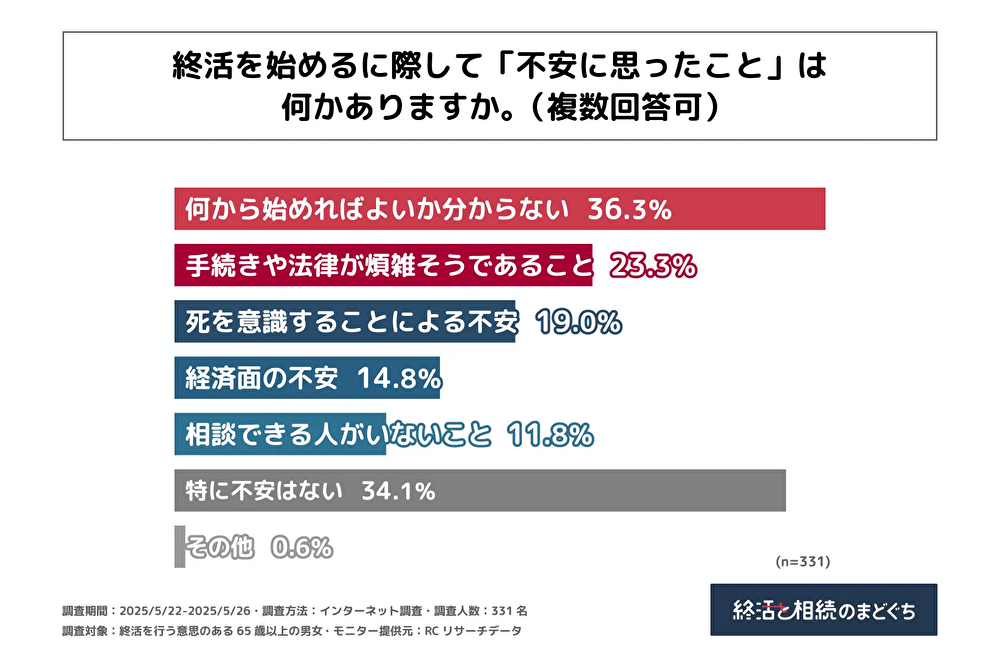 「終活を始める際に不安だったこと」は、1位:何から始めればよいか分からない(36.3%)、2位:特に不安はない(34.1%)、3位:手続きや法律が煩雑そう(23.3%)。最初の一歩の踏み出し方への戸惑いが最多となりました。
